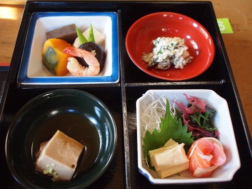 (左上から時計回り)煮物、白和え、刺身(サーモンと湯葉)、