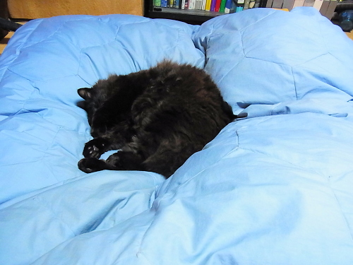 夜は外出していたけど、昼間はこんな風に布団のど真ん中で寝る福太郎。