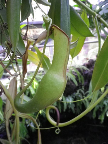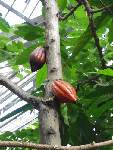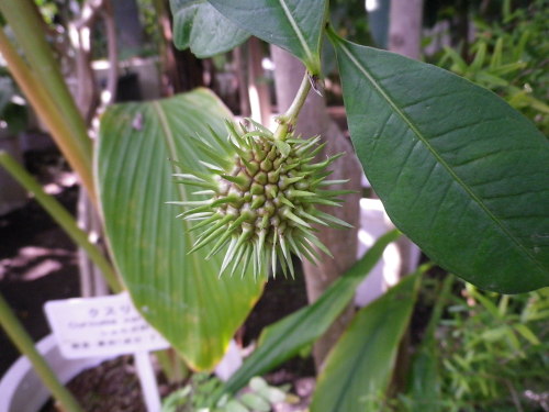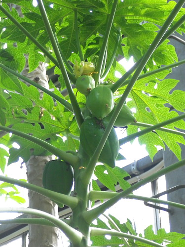 何これ? バニラの実(矢印) これが黒く熟すと、あの甘いバニラの香りがするのだそうです。 パパイヤ。 まだ青い・・・ 「ノルウェイの森」の公開に合わせてか、 同じ監督の作品「青いパパイヤの香り」が期間限定で上映されていた。 ビデオで見たけど美しい映像の映画だった。 バナナ。 やはり、まだ青い・・・ ウツボカズラ。 カカオの実。 温室の中ってなんとなく美味しそうなものばかり・・・ 何かの葉っぱがシルエットになっていました。