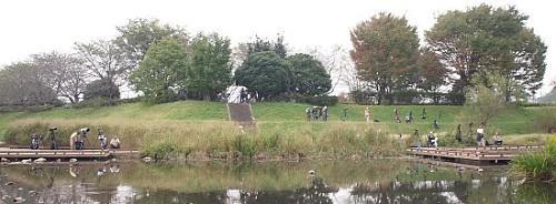 調整池で野鳥の写真を撮る人たち。