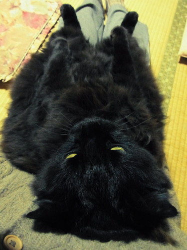 足の上で怠慢なポーズでくつろぐ福太郎。
